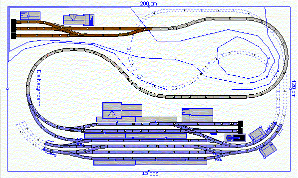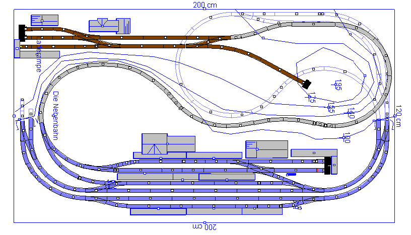 Geplant ist eine Anlage, die es erlaubt, auf der zweigleisigen Hauptbahn einen automatischen Zugverkehr durchzuführen. Das natürlich mit Polymatik und Blocksteuerung. Die Nebenbahn soll es dem Bediener ermöglichen, Rangier- und Fahrbetrieb durchzuführen. Eine übergabe von Zügen zwischen Haupt- und Nebenbahn soll möglich sein. Die Neigung der unterirdischen Steigung (die lange obere Gerade auf dem unteren Bild) beträgt 2,63%, Das Gefälle vom "Hauptbahnhof" in den Schattenbahnhof fast 3,8%. Die Steigung der Nebenbahn beträgt 2,59%. An Gleisradien überwiegen aufgrund der kleinen zur Verfügung stehenden Fläche 286mm und 330mm. Die damit verbundene Einschränkung des Fuhrparks nehme ich in Kauf.