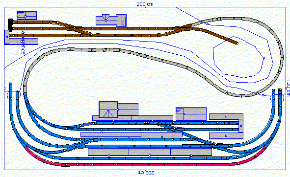 Das lila eingefärbte Gleis hat eine NL von 120cm. Ein Zug, der diese Länge ausschöpft, koennte nur an diesem Bahnsteig halten und muesste in der Gegenrichtung durchfahren.